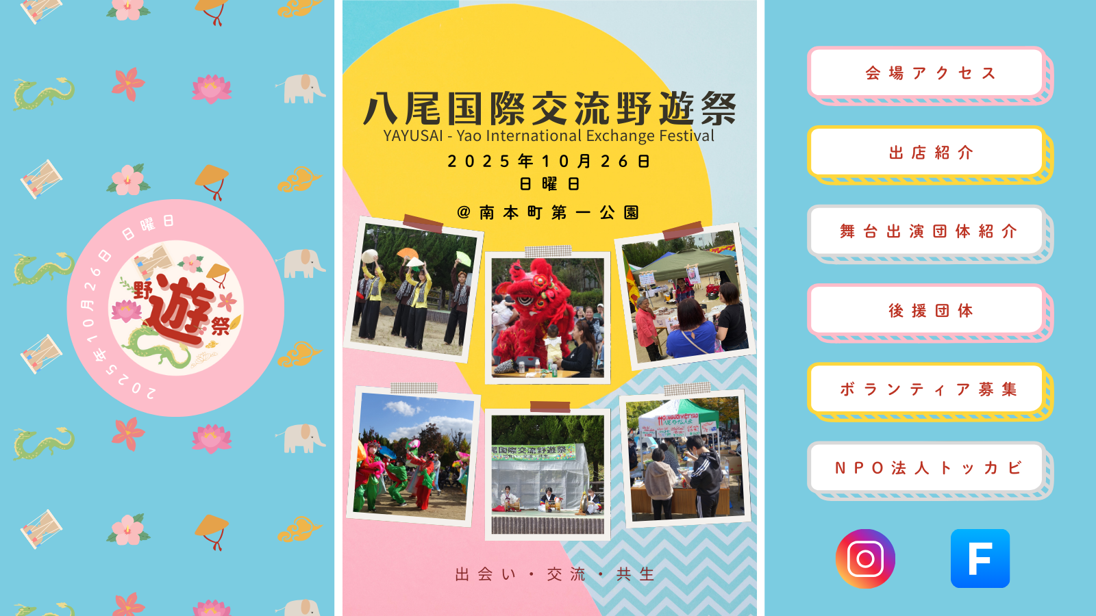 八尾市南本町第一公園で毎年開催しています。2025年度は10月26日(日)11:00-15:00で開催しています。詳しくはホームページで。