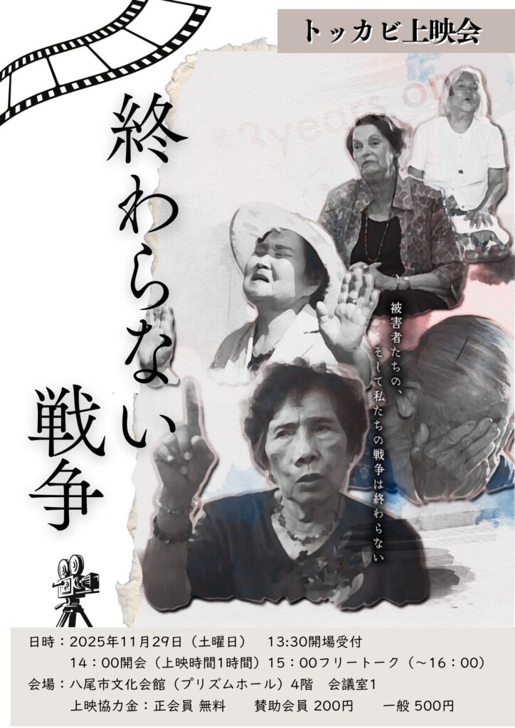 ※「終わらない戦争」の上映後、作品を通して感じたこと、考えたことを、参加者どうしで自由にお話しする時間です。 特別な準備や知識は必要ありません。 話すのが苦手な方は、聞くだけの参加も歓迎です。静かに振り返りたい方もどうぞそのままでご参加ください。